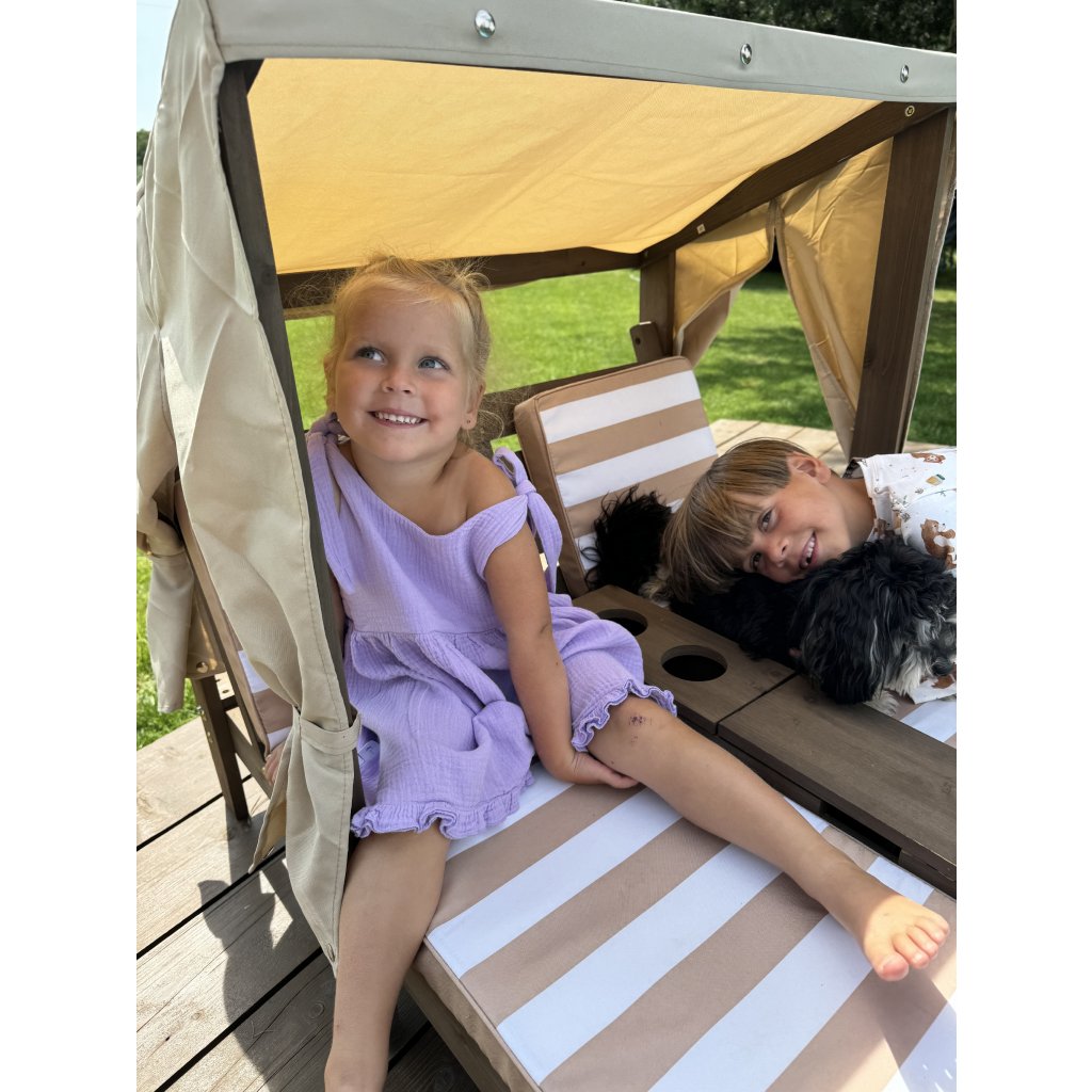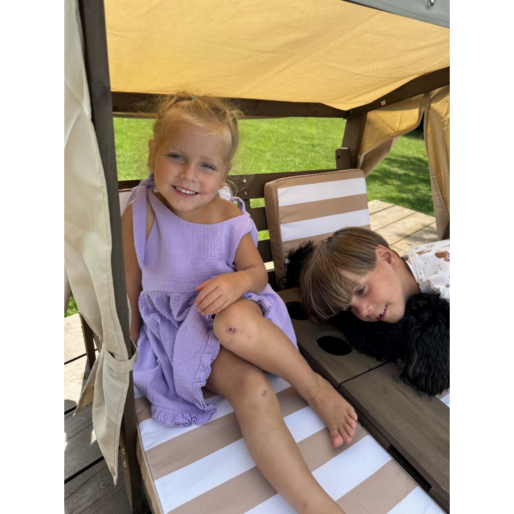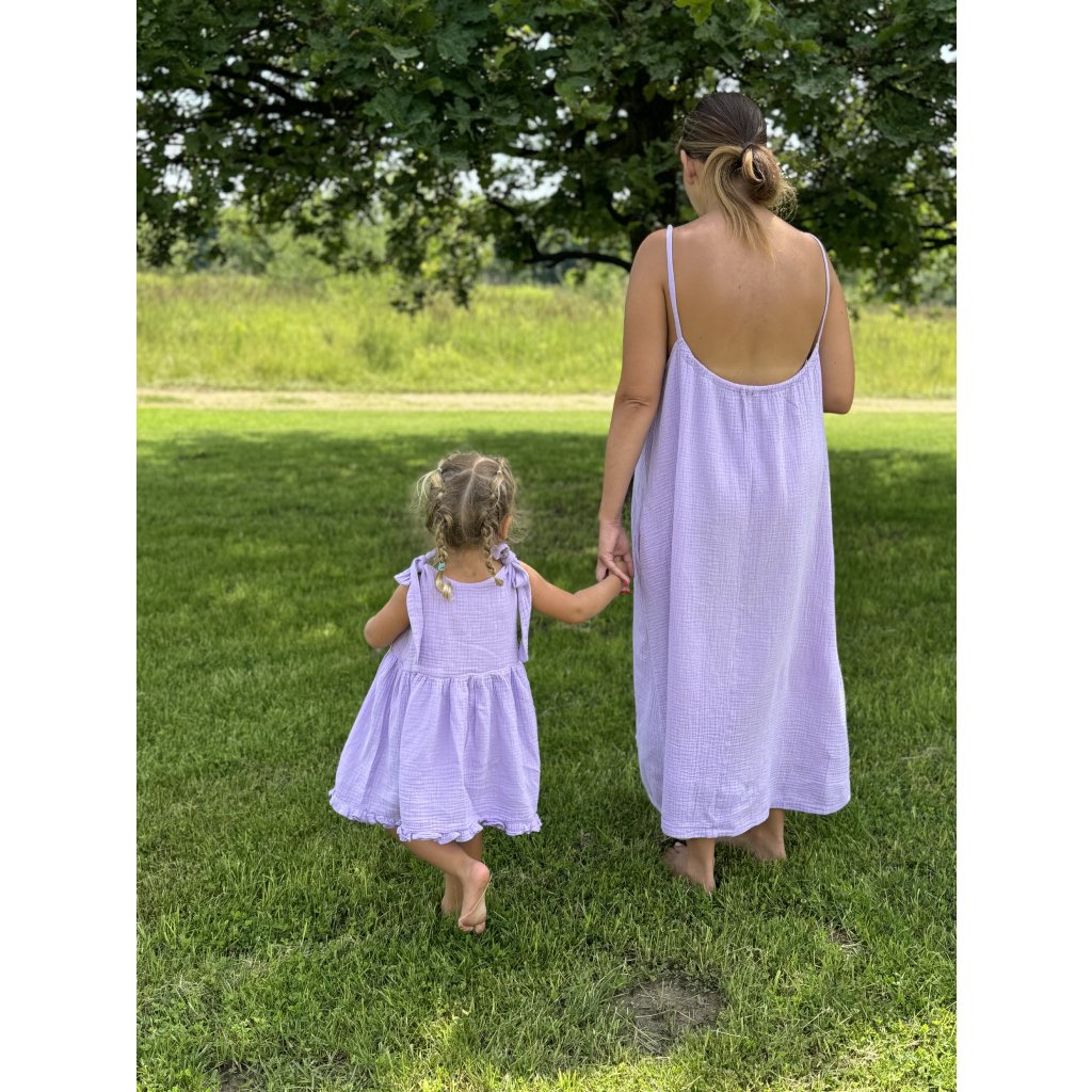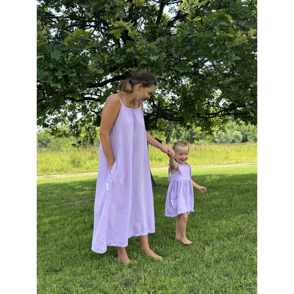 Šaty jsou ušity z velmi příjemného mušelínu, který je lehoučký, dobře savý a hlavně příjemný na dotek. Tyto vlastnosti oceníte, když půjdete s dítětem na bazén, dovolenku, nebo jen tak na procházku.