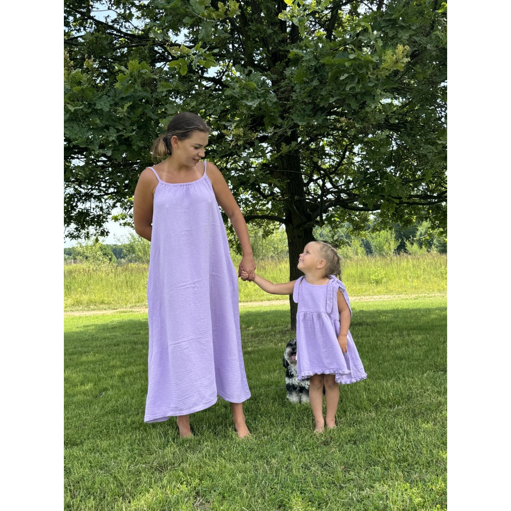 Šaty jsou ušity z velmi příjemného mušelínu, který je lehoučký, dobře savý a hlavně příjemný na dotek. Tyto vlastnosti oceníte, když půjdete s dítětem na bazén, dovolenku, nebo jen tak na procházku.
