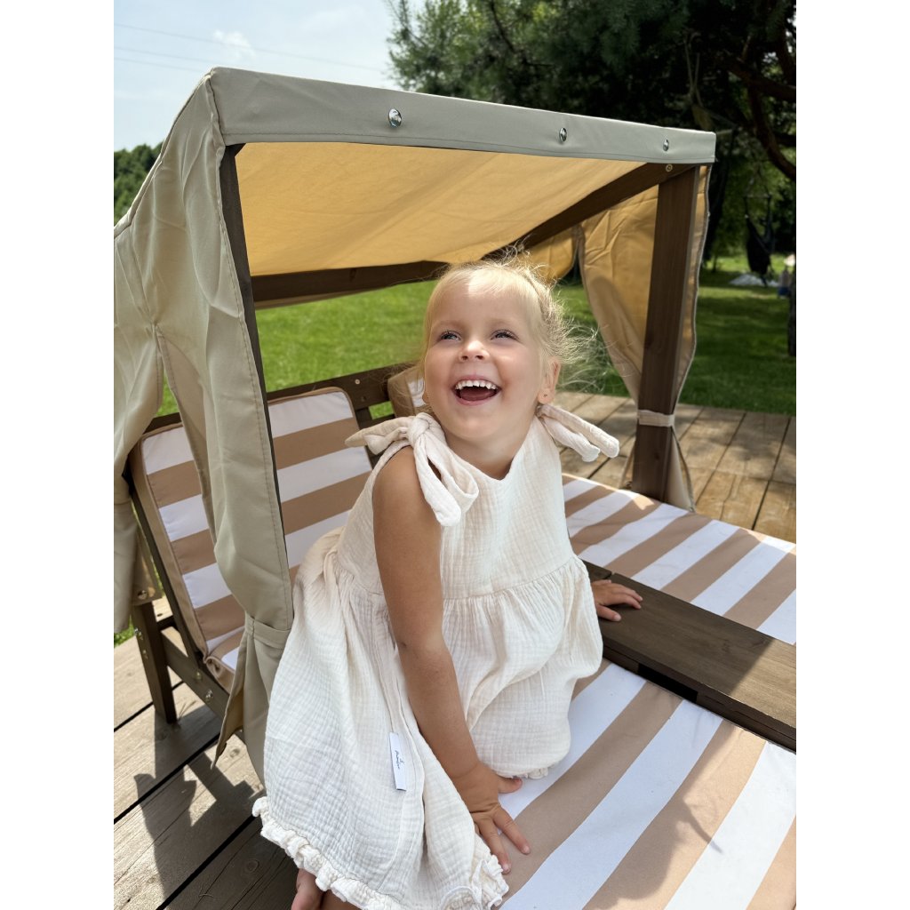 Šaty jsou ušity z velmi příjemného mušelínu, který je lehoučký, dobře savý a hlavně příjemný na dotek. Tyto vlastnosti oceníte, když půjdete s dítětem na bazén, dovolenku, nebo jen tak na procházku.