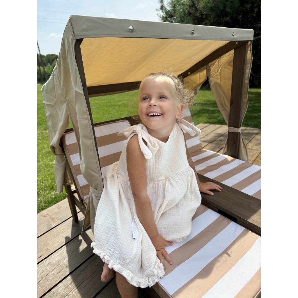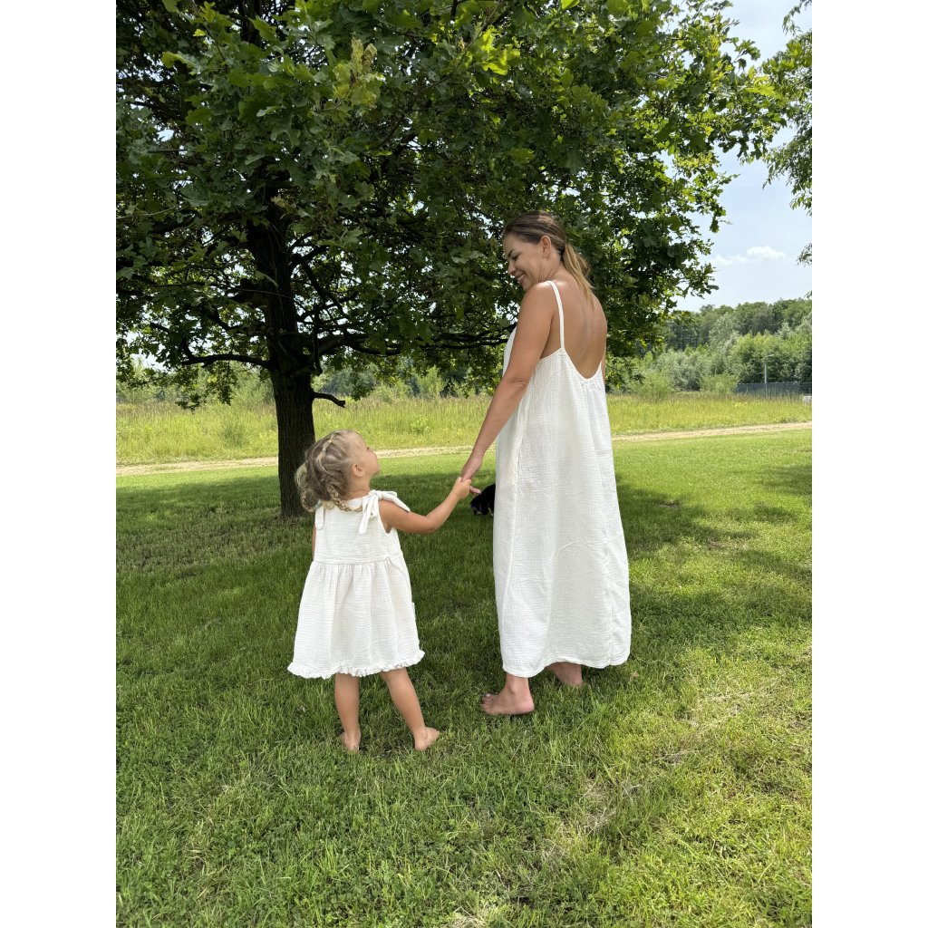 Šaty jsou ušity z velmi příjemného mušelínu, který je lehoučký, dobře savý a hlavně příjemný na dotek. Tyto vlastnosti oceníte, když půjdete s dítětem na bazén, dovolenku, nebo jen tak na procházku.